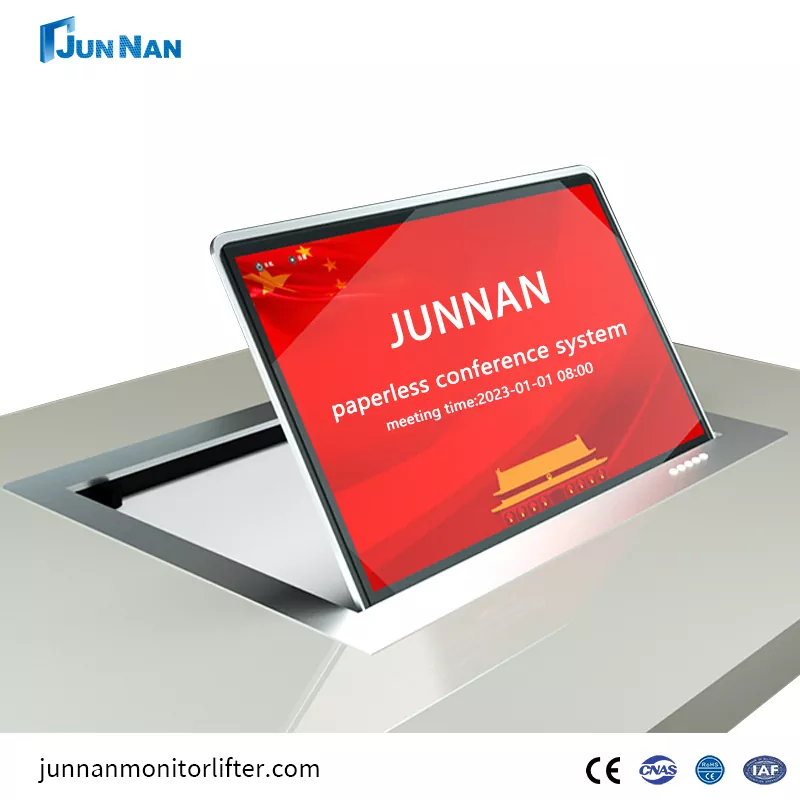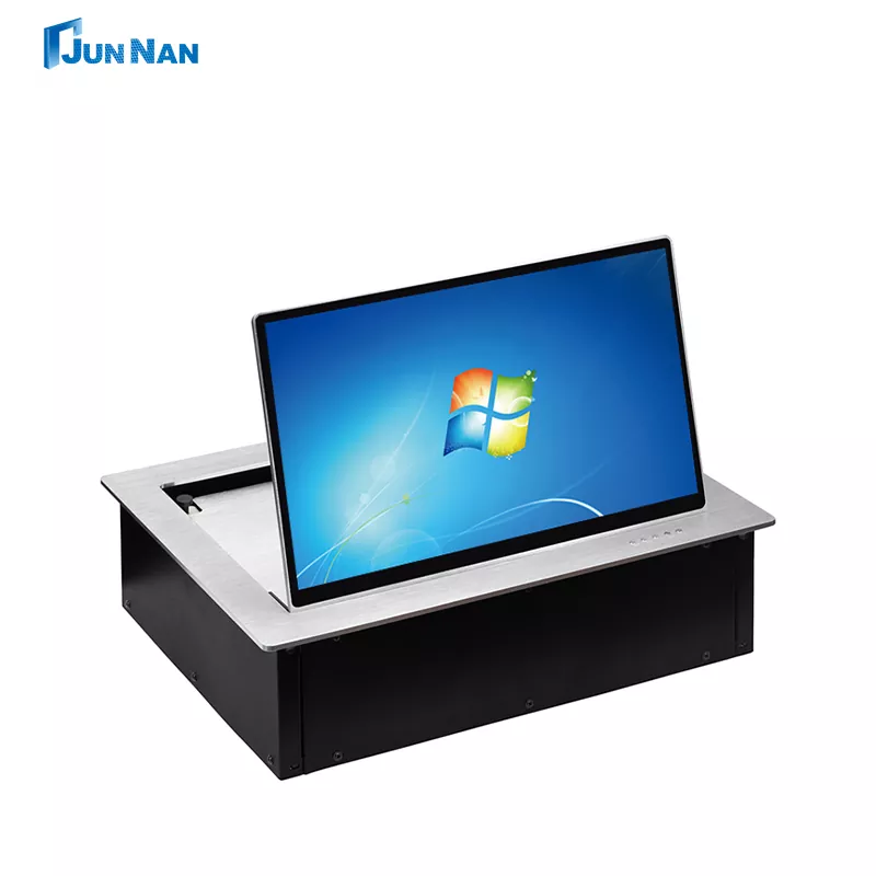 గ్వాంగ్జౌ జున్నన్ చైనాలోని lcd డెస్క్టాప్ ఫ్లిప్ డిస్ప్లే స్క్రీన్ కాన్ఫరెన్స్ సిస్టమ్ యొక్క ప్రొఫెషనల్ తయారీదారు. డెస్క్టాప్ ఫ్లిప్ మానిటర్లు ప్రధానంగా హై-లెవల్ ఎగ్జిక్యూటివ్ కాన్ఫరెన్స్ టేబుల్లలో ఉపయోగించబడతాయి, కాన్ఫరెన్స్ డెస్క్టాప్ ఫ్లిప్ మానిటర్లు అంతర్నిర్మిత అధిక-పనితీరు గల టచ్ ఫంక్షన్ను కలిగి ఉంటాయి మరియు స్థిరమైన ఆపరేషన్ను నిర్ధారించడానికి ఫ్లిప్ ప్యానెల్ AC మోటార్ కంట్రోల్ ద్వారా తిప్పబడుతుంది. మోటరైజ్డ్ కంట్రోల్ ద్వారా డెస్క్టాప్ ఫ్లిప్ మానిటర్లు, ఉత్తమ వీక్షణ కోణం ప్రభావాన్ని పొందడానికి ఫ్లిప్పర్ మానిటర్ను లంబ కోణంలో సులభంగా తిప్పగలదు మరియు మంచి స్థిరత్వం మరియు షాక్ నిరోధకతను కలిగి ఉంటుంది. విద్యుత్ నియంత్రణ ద్వారా, ఫ్లిప్పర్ ఉత్తమ వీక్షణ కోణ ప్రభావాన్ని సాధించడానికి మానిటర్ను లంబ కోణంలో సులభంగా తిప్పగలదు. మైక్రోఫోన్తో అమర్చవచ్చు, ఫ్లిప్ చేయడానికి, ముందుకు వెనుకకు సర్దుబాటు చేయడానికి కీ, యాంటీ-పించ్ ఫంక్షన్తో, సురక్షితమైన మరియు ఆందోళన లేని, దాచిన పొందుపరిచిన ఇన్స్టాలేషన్ చాలా అందంగా ఉంటుంది.
